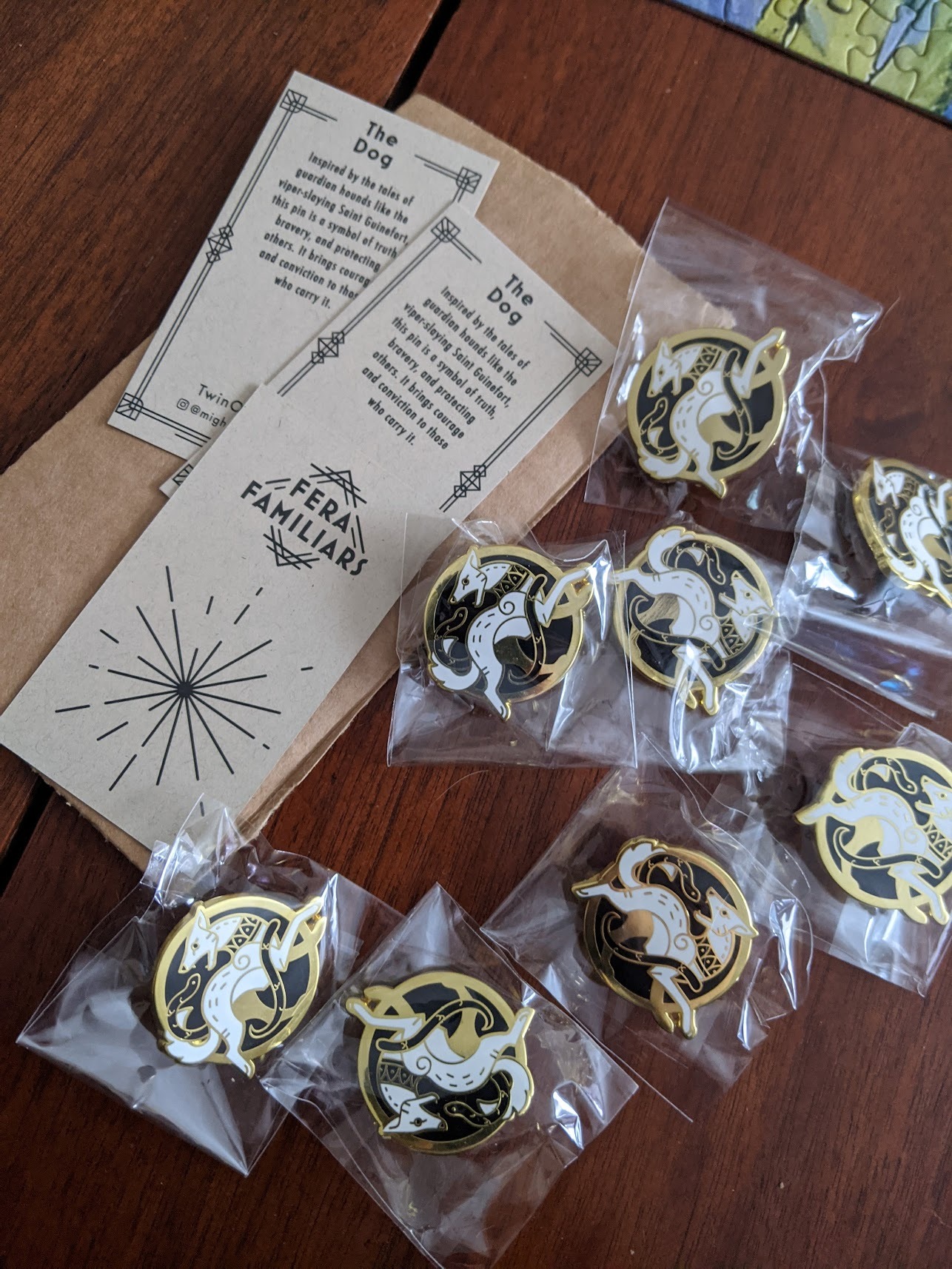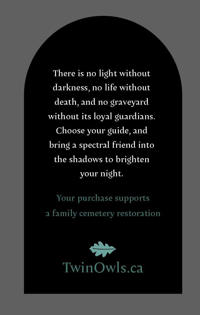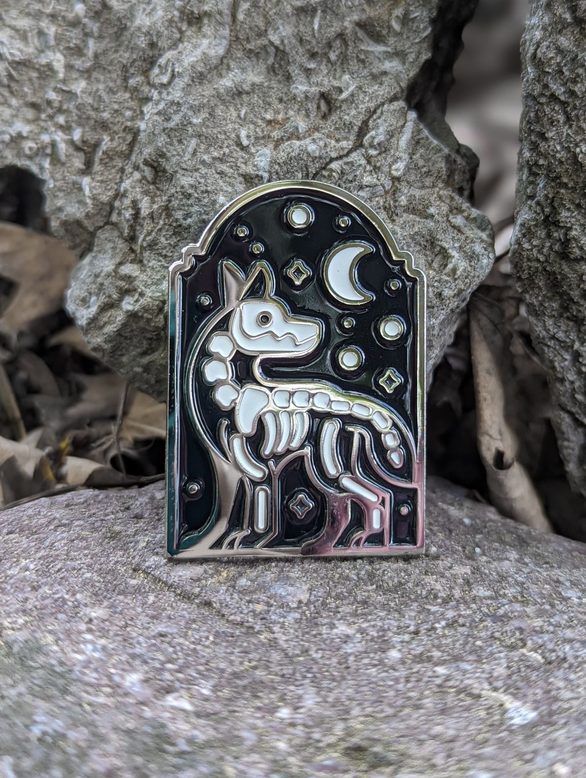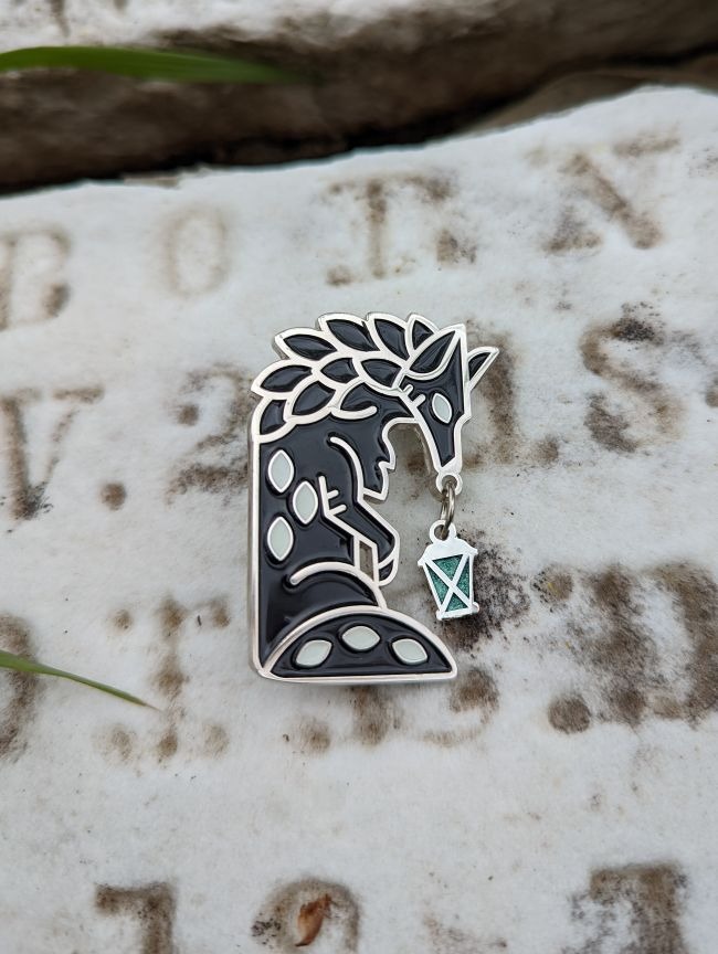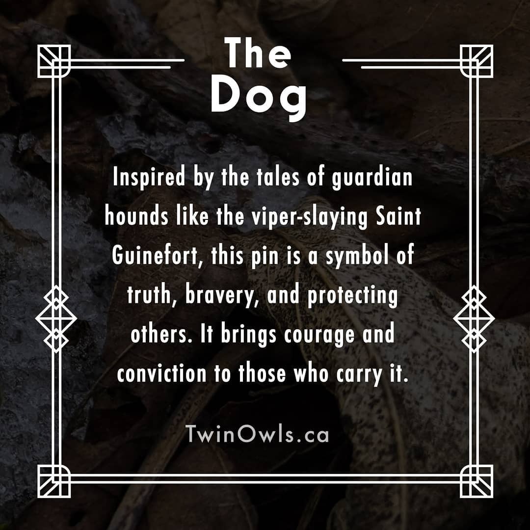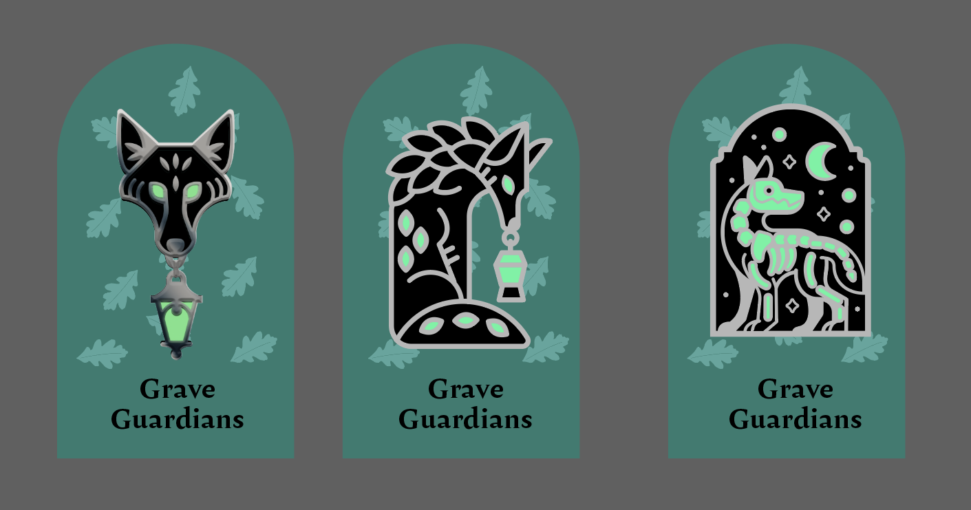 A set of three glow in the dark enamel pins. I worked with my client to develop a title for the series and researched the church grim, a guardian hound spirit believed to protect church graveyards, to bring that lore into the product descriptions.