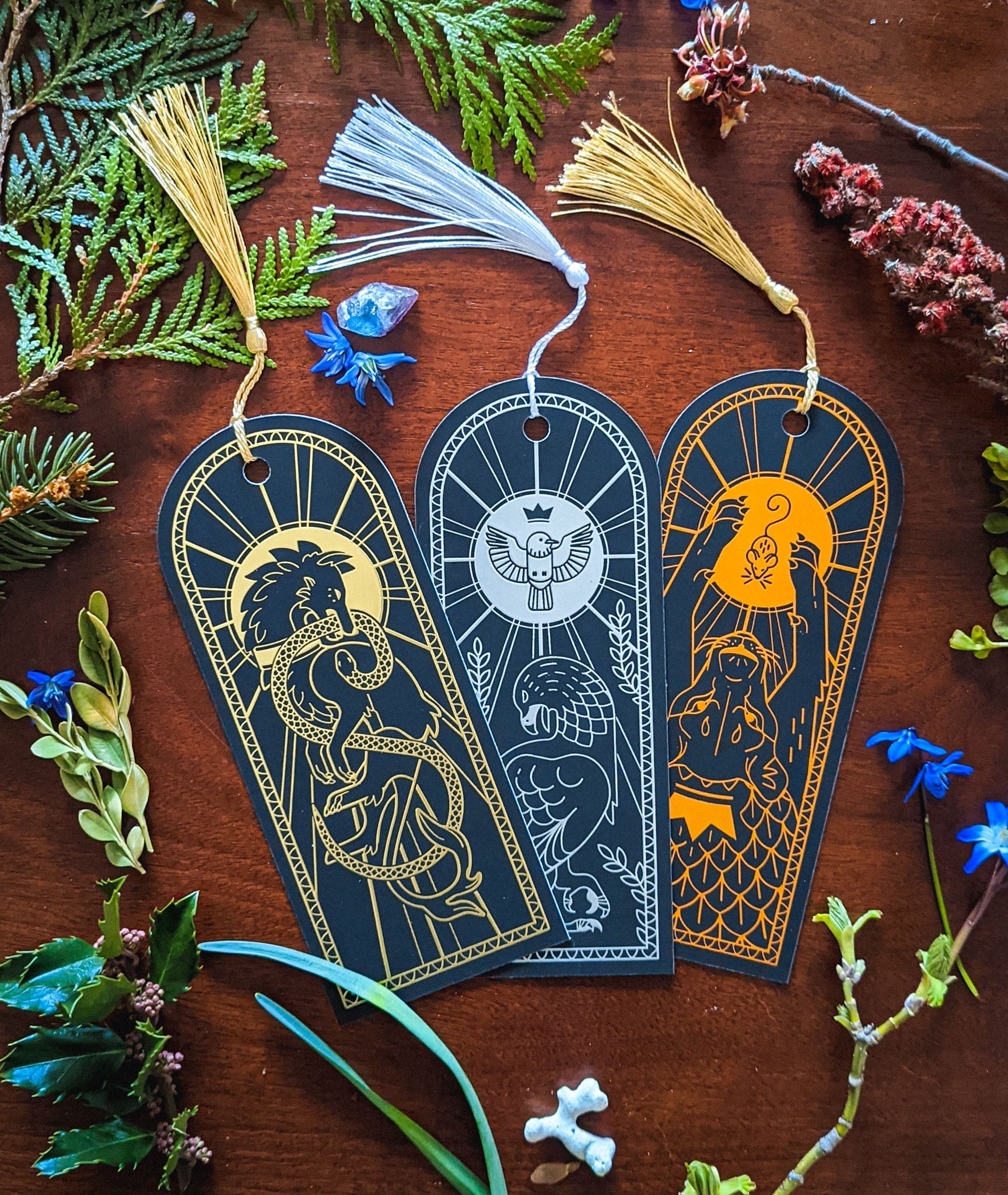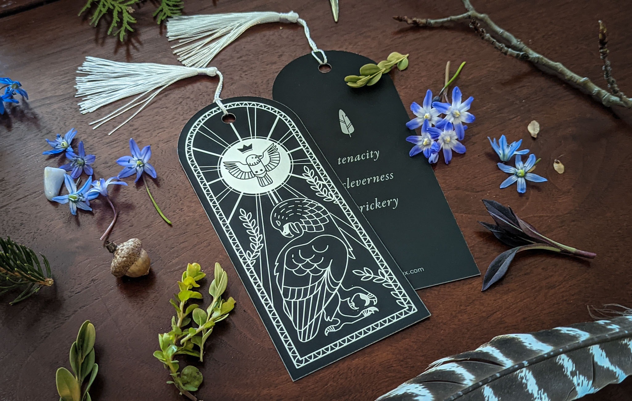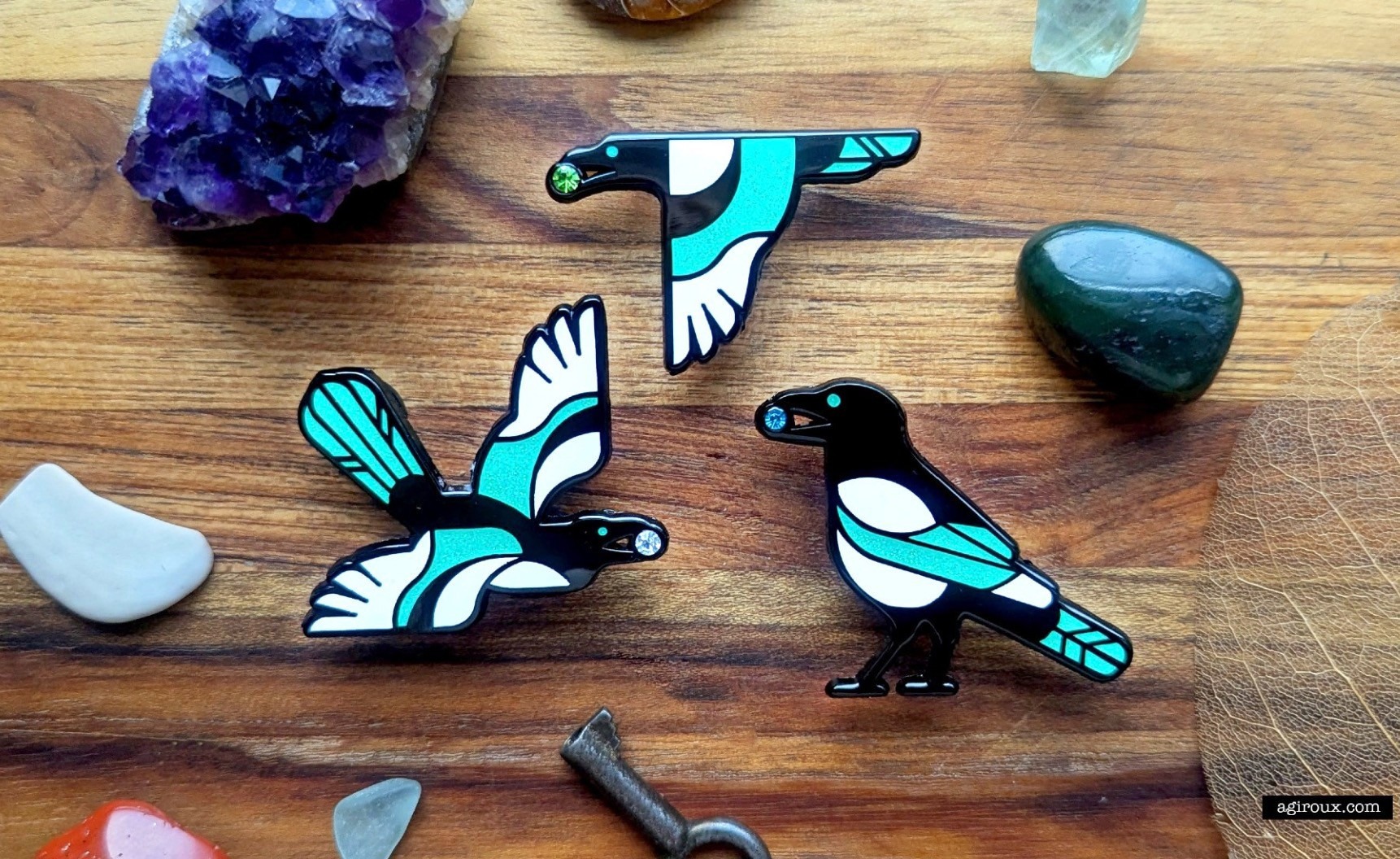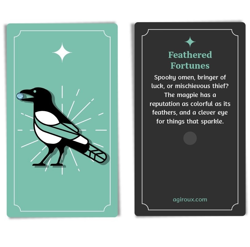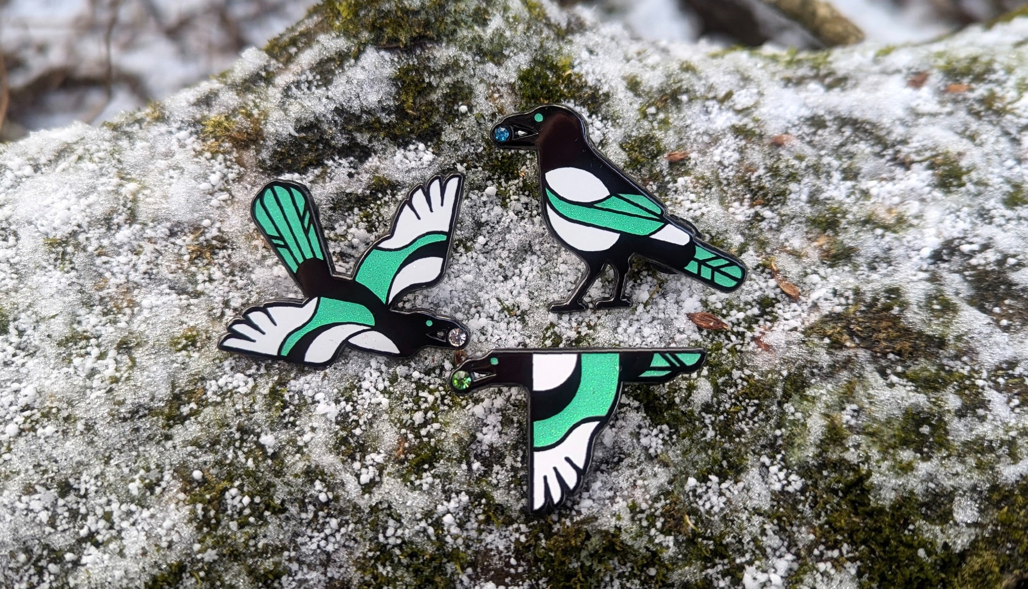 A set of three glitter enamel pins. I researched myths and lore on the magpie to create a description of the set that evoked both the light and dark side of the bird's colourful reputation, as well as the symbolism of each rhinestone (peridot, crystal, and aquamarine) to create a short promotional social media post for each.
