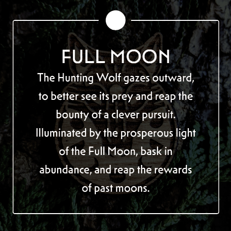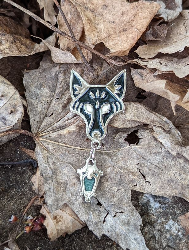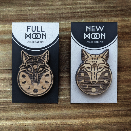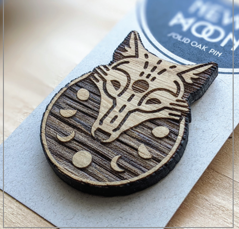 A pair of solid oak wolf pins. My client's vision for the romance text was to bring together moon magic lore and a tale of two wolves. Each wolf was a mirror of the other to allow them to stand alone or pair together as a set, so I created a mirrored pair of stories to go along with each pin, drawing from moon mysticism and pagan traditions.